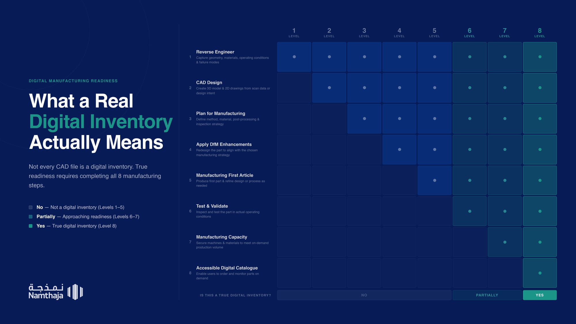 يكشف الجدول أن معظم ما يسمى اليوم مخزونا رقميا لا يتجاوز المستويات الأولى، وهي مستويات لا تكفي فعليا لاستبدال المخزون الفيزيائي، إذ تبقى القطعة غير مثبتة ميدانيا وغير مرتبطة بطاقة إنتاجية جاهزة يمكن الاعتماد عليها. فلا يمكن اعتبار أن لدينا مخزوناً رقمياً فعليا إلا عند تحقق معيارين رئيسيين (وهو ما يمثل أعلى مستويات النضج في الجدول):